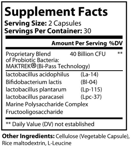 40 Billion CFU; Probiotic capsules are formulated to support athletic performance, enhanced gut micro biome, increased muscle mass, immune health, reduced cortisol levels, digestive health, cognitive function, and improved allergy symptoms.